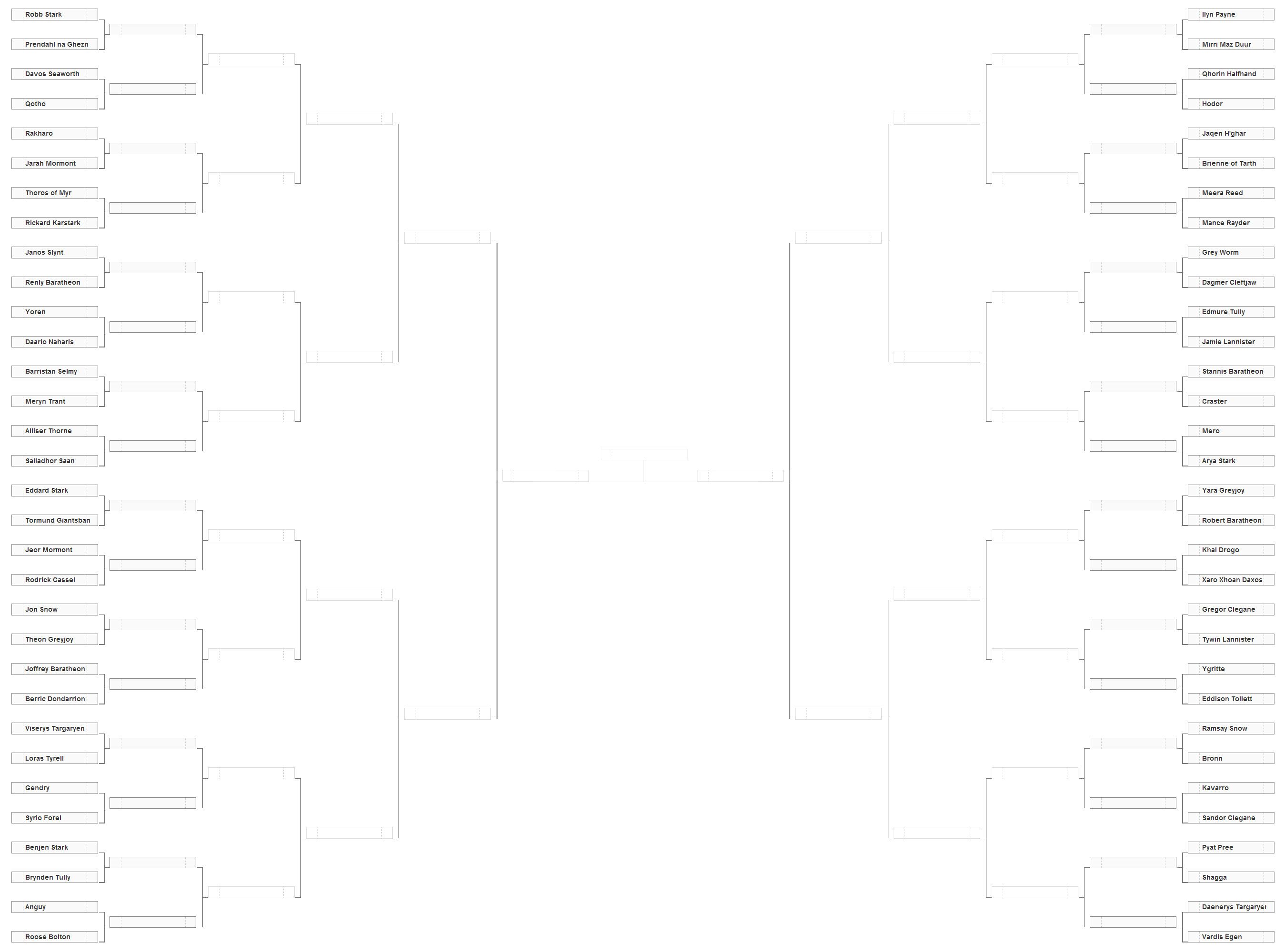 We took the 64 best fighters from Essos to Westeros and put them in a random bracket and matched them up against each other in a single elimination tournament until we had a 1st, 2nd, and 3rd places. True in hindsight a double elimination would have been a better, it would have eliminated a few early exits. But hey this is good enough.