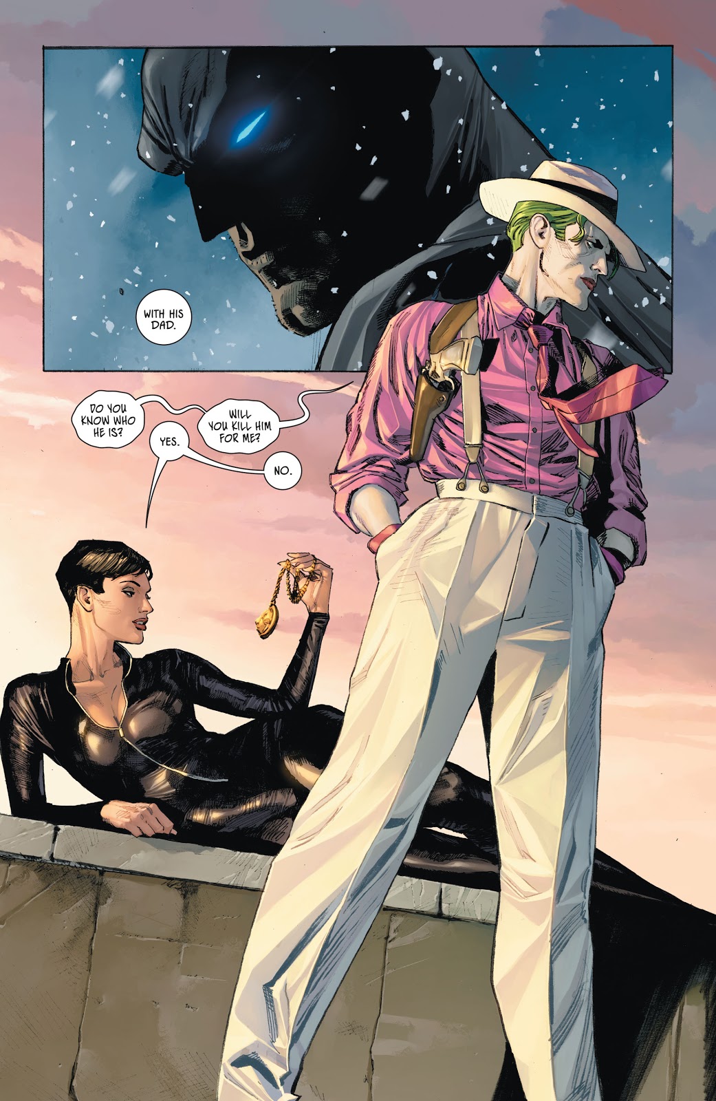 The two other timelines don’t really focus on Batman. They center on the other two players. Catwoman and Joker. In the past it seems that a calmer Joker and Catwoman are almost friends? Acquaintances? Unclear, but they have a conversation on their mutual love, that being Batman. The scenes with these two have amazing dialogue, and features The Joker’s flyest outfit ever.