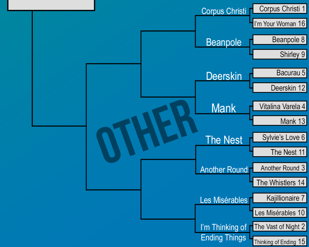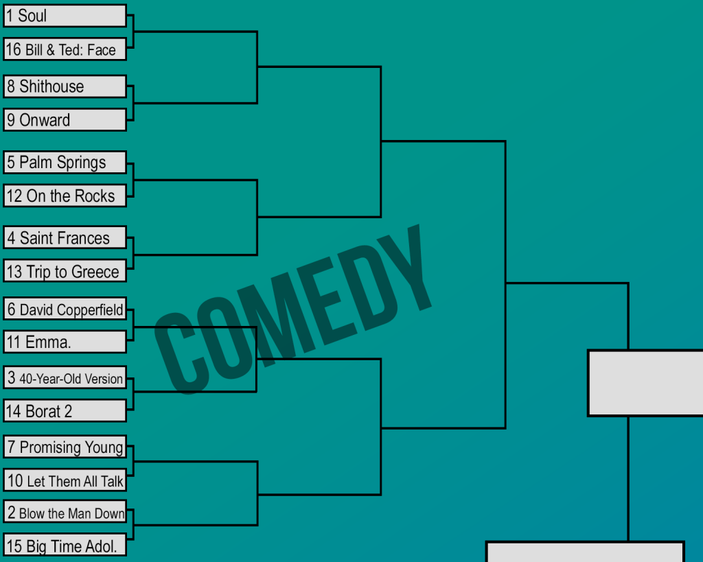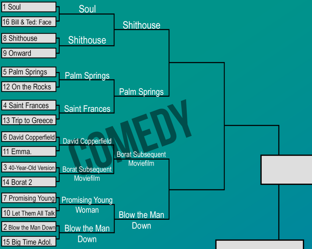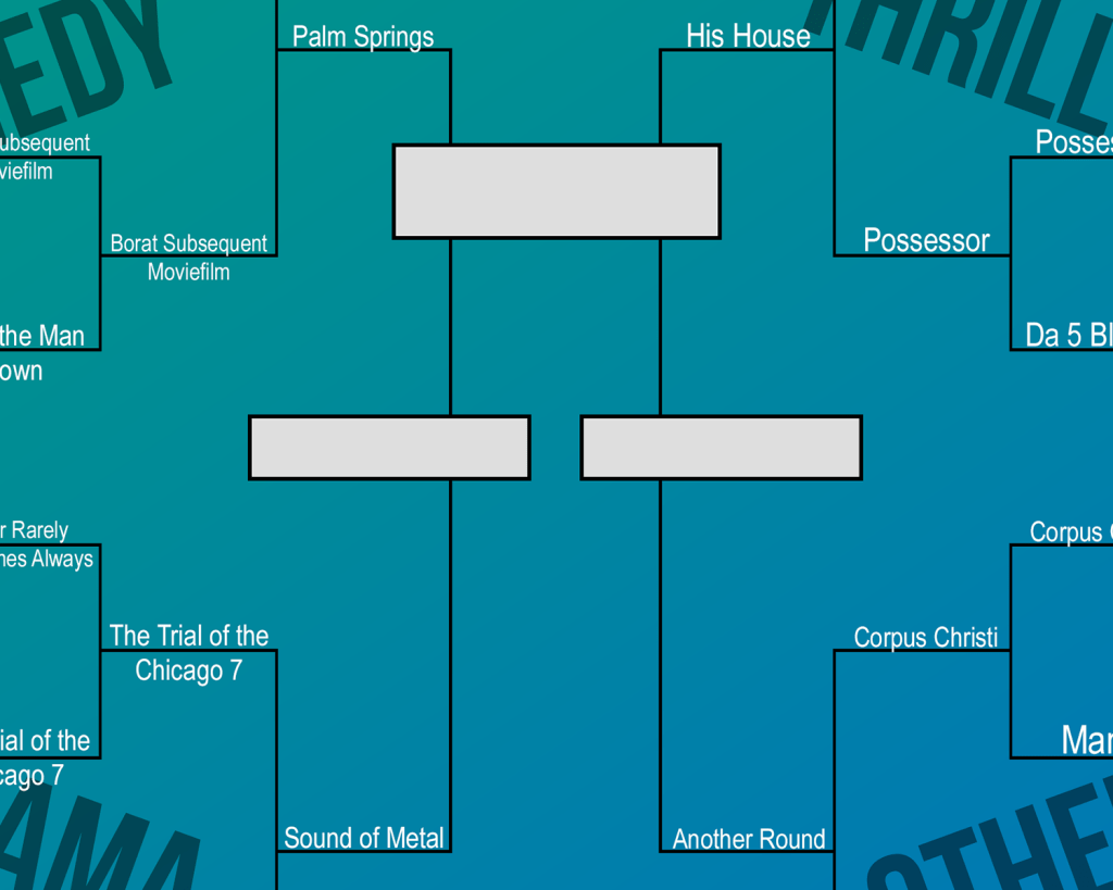 The first task was to separate all 123 movies into four categories that would make up our divisions: comedy, drama, thrills, and other. The first two, comedy and drama, are pretty self-explanatory I would imagine. Thrills is more of a gut reaction than a perfectly definable category; any action movie and any horror movie certainly but also films like Paul Greengrass’s fast-paced western, News of the World, and flawed Tom Hardy vehicle, Capone, which despite my best efforts to fudge the numbers I couldn’t find a way to sneak into the final 64 were also placed in the Thrills division. Other, is a little more fraudulent even I’ll admit. Other consists of all foreign language films as well as any film that felt too in between genres to reasonably put in either of the other three categories. Movies like endearingly strange Kajillionaire which is neither funny enough to be a comedy nor self-serious enough to feel like it belongs in the same category as Never Rarely Sometimes Always and The Trial of the Chicago 7.