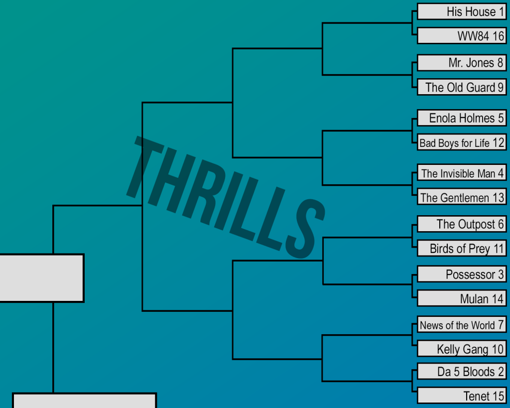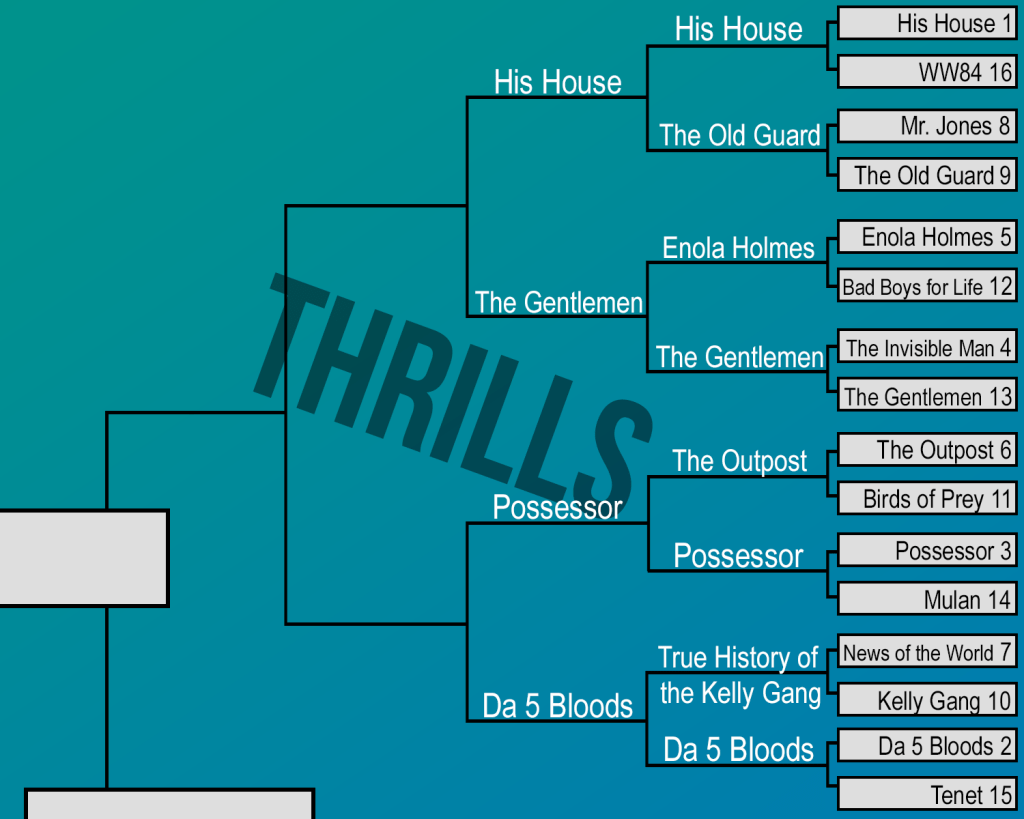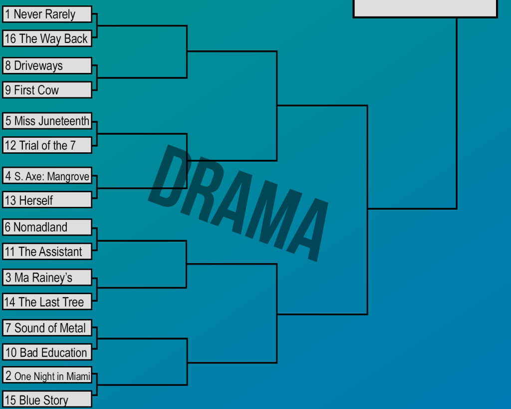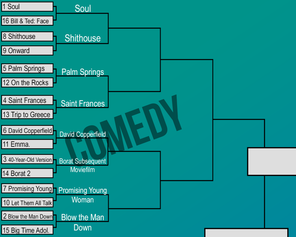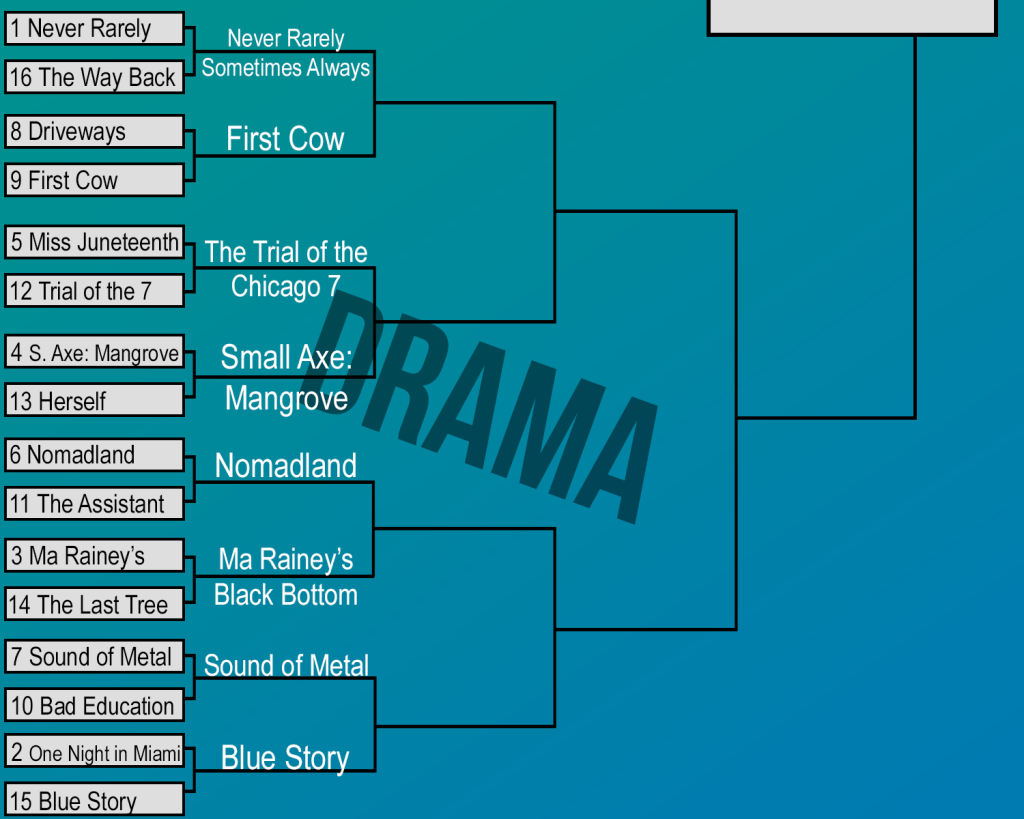 The first task was to separate all 123 movies into four categories that would make up our divisions: comedy, drama, thrills, and other. The first two, comedy and drama, are pretty self-explanatory I would imagine. Thrills is more of a gut reaction than a perfectly definable category; any action movie and any horror movie certainly but also films like Paul Greengrass’s fast-paced western, News of the World, and flawed Tom Hardy vehicle, Capone, which despite my best efforts to fudge the numbers I couldn’t find a way to sneak into the final 64 were also placed in the Thrills division. Other, is a little more fraudulent even I’ll admit. Other consists of all foreign language films as well as any film that felt too in between genres to reasonably put in either of the other three categories. Movies like endearingly strange Kajillionaire which is neither funny enough to be a comedy nor self-serious enough to feel like it belongs in the same category as Never Rarely Sometimes Always and The Trial of the Chicago 7.