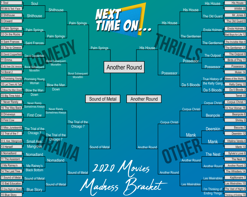 Last week one team of basketball players beat another team of basketball players to determine who is the best semi-amateur basketball team in the United States made of players above the age of 17 and below the age of 22 who have all graduated high school. And in a few weeks’ time the Academy Awards will determine what the best movies of 2020 were. Which means two things, it’s been a whole year and a month of this collective nightmare and it’s the perfect time for a tournament themed movie piece.