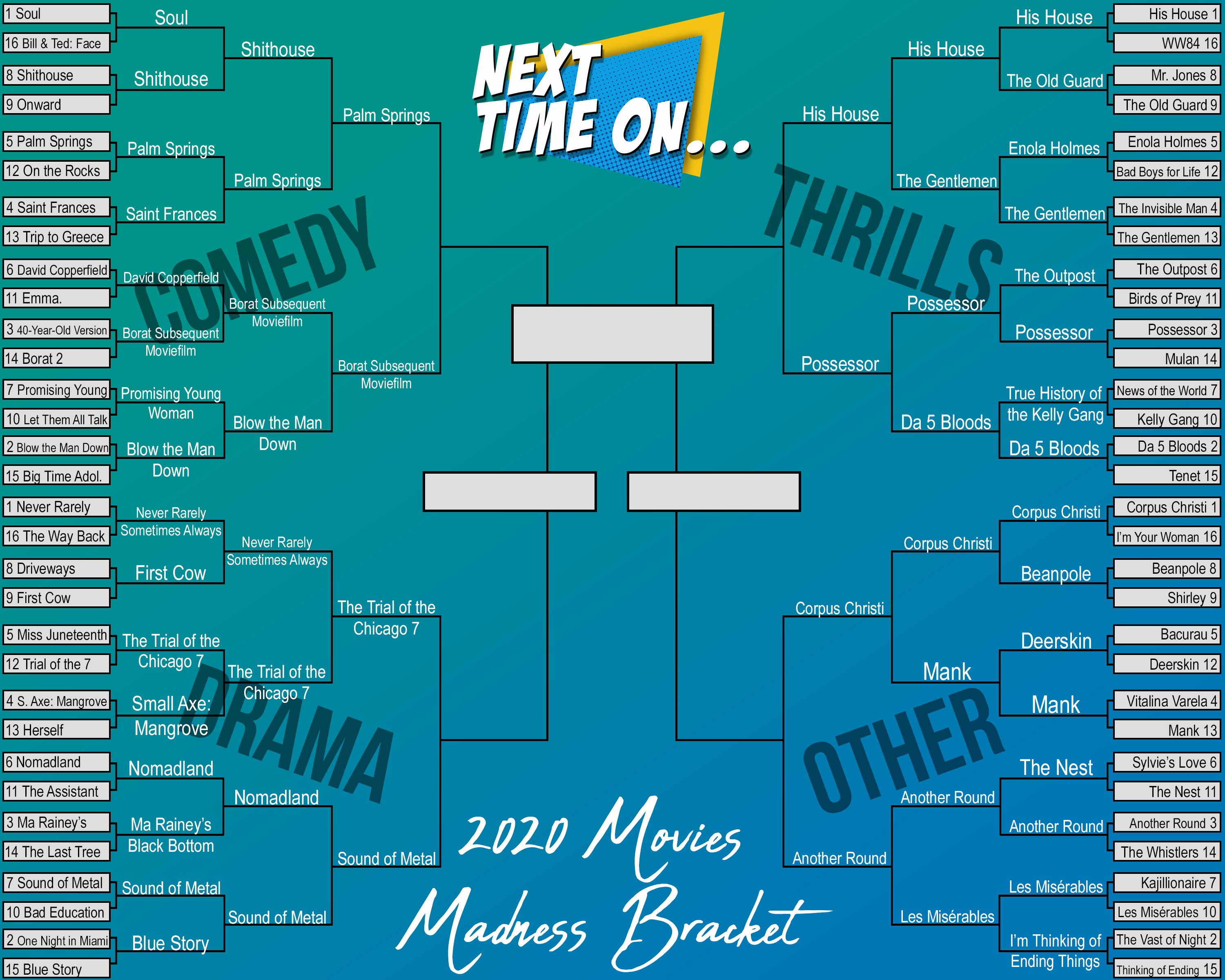 The first task was to separate all 123 movies into four categories that would make up our divisions: comedy, drama, thrills, and other. The first two, comedy and drama, are pretty self-explanatory I would imagine. Thrills is more of a gut reaction than a perfectly definable category; any action movie and any horror movie certainly but also films like Paul Greengrass’s fast-paced western, News of the World, and flawed Tom Hardy vehicle, Capone, which despite my best efforts to fudge the numbers I couldn’t find a way to sneak into the final 64 were also placed in the Thrills division. Other, is a little more fraudulent even I’ll admit. Other consists of all foreign language films as well as any film that felt too in between genres to reasonably put in either of the other three categories. Movies like endearingly strange Kajillionaire which is neither funny enough to be a comedy nor self-serious enough to feel like it belongs in the same category as Never Rarely Sometimes Always and The Trial of the Chicago 7.